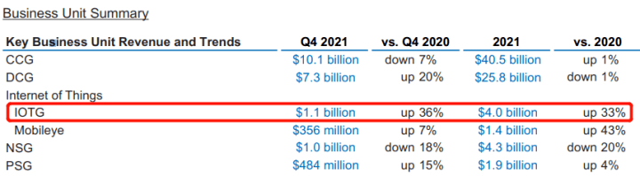 在晶圓代工巨頭臺(tái)積電公布的財(cái)報(bào)中,2021年其手機(jī)業(yè)務(wù)營收首次被HPC(大型高性能計(jì)算)業(yè)務(wù)超越,面向汽車板塊的營收和訂單需求也猛增。 圖像傳感器芯片設(shè)計(jì)龍頭韋爾股份最新財(cái)報(bào)顯示,其半導(dǎo)體業(yè)務(wù)收入同比增長18%,雖然智能手機(jī)CMOS占據(jù)營收大頭,但業(yè)績增長主要來源于車載CIS與安防CIS,尤其在安防領(lǐng)域?qū)崿F(xiàn)高達(dá)60%的業(yè)績增長。 2021年物聯(lián)網(wǎng)事業(yè)部(IoTG)成為國際半導(dǎo)體巨頭英特爾增長最快的業(yè)務(wù),同比增長33%,同時(shí)汽車自動(dòng)駕駛業(yè)務(wù)也增速驚人,反觀主營PC終端的CCG部門業(yè)績僅增1個(gè)百分點(diǎn)。