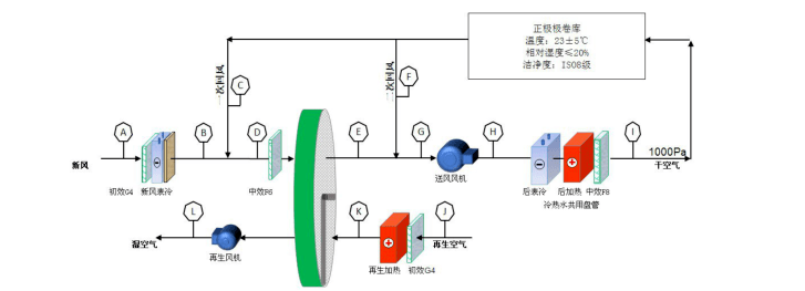 3)低露點濕度需求空調房間,如干燥間、化成間以及注液間等房間,其濕度控制需求為露點≤-50℃,甚至更高,該需求現有的一級轉輪除濕機組很難滿足工藝需求,工程中一般設置兩級轉輪除濕段對房間空氣進行處理,以滿足使用需求。